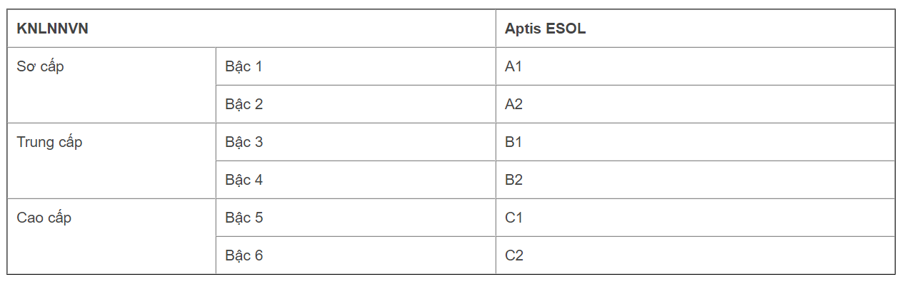 Ngày 31 tháng 03 năm 2023, Bộ GD-ĐT đã ban hành Quyết định số 925/QĐ-BGDĐT công nhận các cấp độ đánh giá năng lực sử dụng tiếng Anh của chứng chỉ Aptis ESOL tương đương với các bậc của Khung năng lực ngoại ngữ 6 bậc dùng cho Việt Nam. Mức độ tương đương cụ thể như sau: